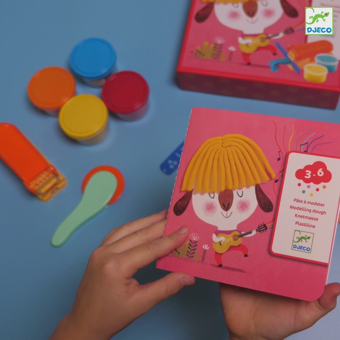 Contains - 4 container of 80gr modelling clay - 4 illustrated boards (20x20 cm) to decorate with the modelling clay - 1 press, and 2 hair clips - 1 hair cutting wheel