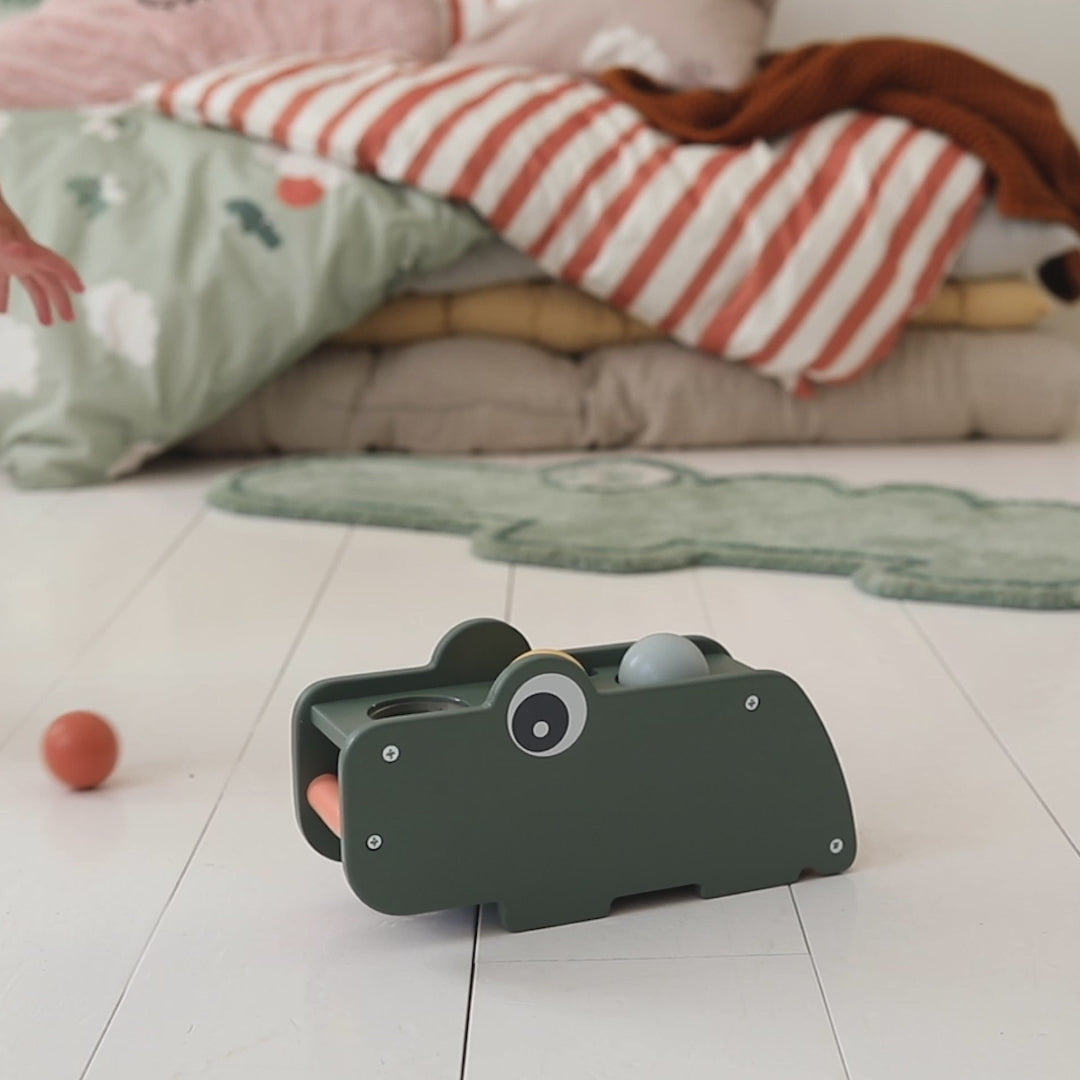 The Croco wooden Hammer Board is a classic toy loved by young children. When the child hits the balls with the hammer, they develop crucial hand-eye coordination and the fun noise stimulates the sense of hearing. The balls are also perfect for give-and-take games, and the flap opening is made of a soft durable fabric that makes an intriguing crinkling sound. Your child can grasp and hold the Croco handle from two sides; in the back to easily carry along, and in the front to explore the balls. Tip them out on the floor - go catch them again! The Croco hammer board is a cool green colour, with brightly coloured balls and hammer. Made from responsibly sourced wood and painted with water based-paints that are free from harmful substances, this durable toy is completely safe for your child to play with.