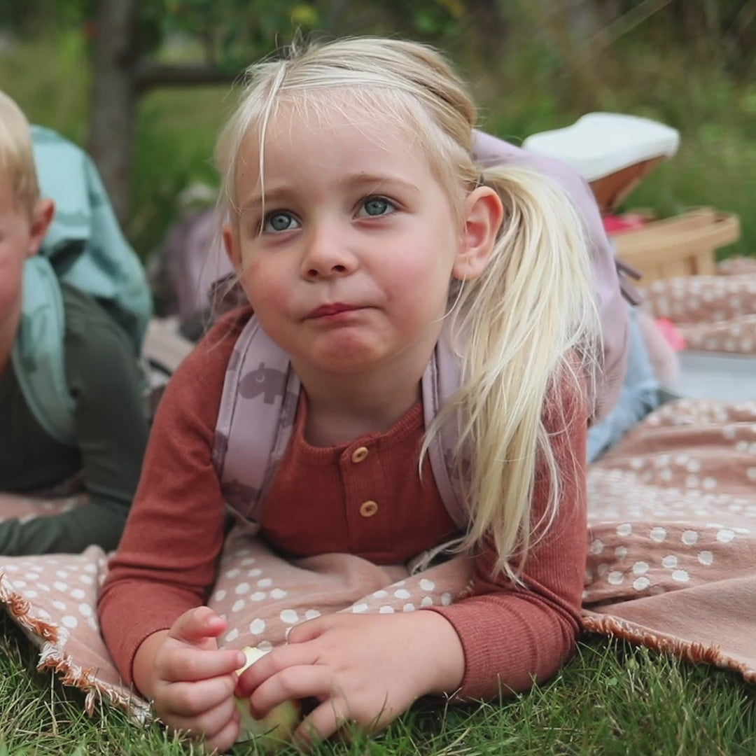 Ozzo PowderThe Ozzo kids backpack is a must-have for little explorers when going on adventures. The adjustable padded shoulder straps and the one-click chest strap make it easy to adjust the bag so it fits perfectly on your child's back. The backpack has a large main compartment which easily fits a lunch box, clothes and all the quirky finds that your child picks up on the way. It has two side pockets with elastic band to fit a bottle and also front pocket with a zipper. The beautiful pwder-coloured children's backpack is decorated with the loveable hippo Ozzo. It is made of 100% polyester which is durable and weatherproof. Inside there is a fun name tag where Ozzo invites your little explorer to come and dance with him.
