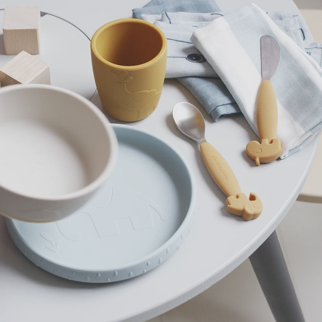 Deer Friends BlueThis Stick and Stay dinner set is thoughtfully created for little eaters. The set, featuring a plate, a bowl, and a mini mug, has lovely blue hues with embossed Deer friends' details. The suction base on the bowl and plate ensures stability during meals, preventing spills and adding ease to mealtime. Made from 100% food-grade, BPA-free silicone, it is safe for kids. Enhance the joy of dinnertime with this functional dinnerware set that combines aesthetic appeal with practical benefits. Ideal for gifting, it brings both delight and convenience to your family dinner table.
