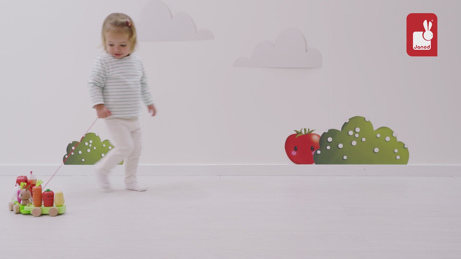 Choo. Choo. Make way for the little farm train with its vegetables and little animals. Attractive wooden train with 3 carriages and 19 pieces to assemble to create vegetables from the garden (potato, tomato, carrot and radish) and animals on the farm (rabbits and hen). This activity will develop fine motor skills in very young children, while older ones can develop their gross motor skills by taking the whole train for a walk, using the string. Early-learning toy in wood from sustainably managed forests.