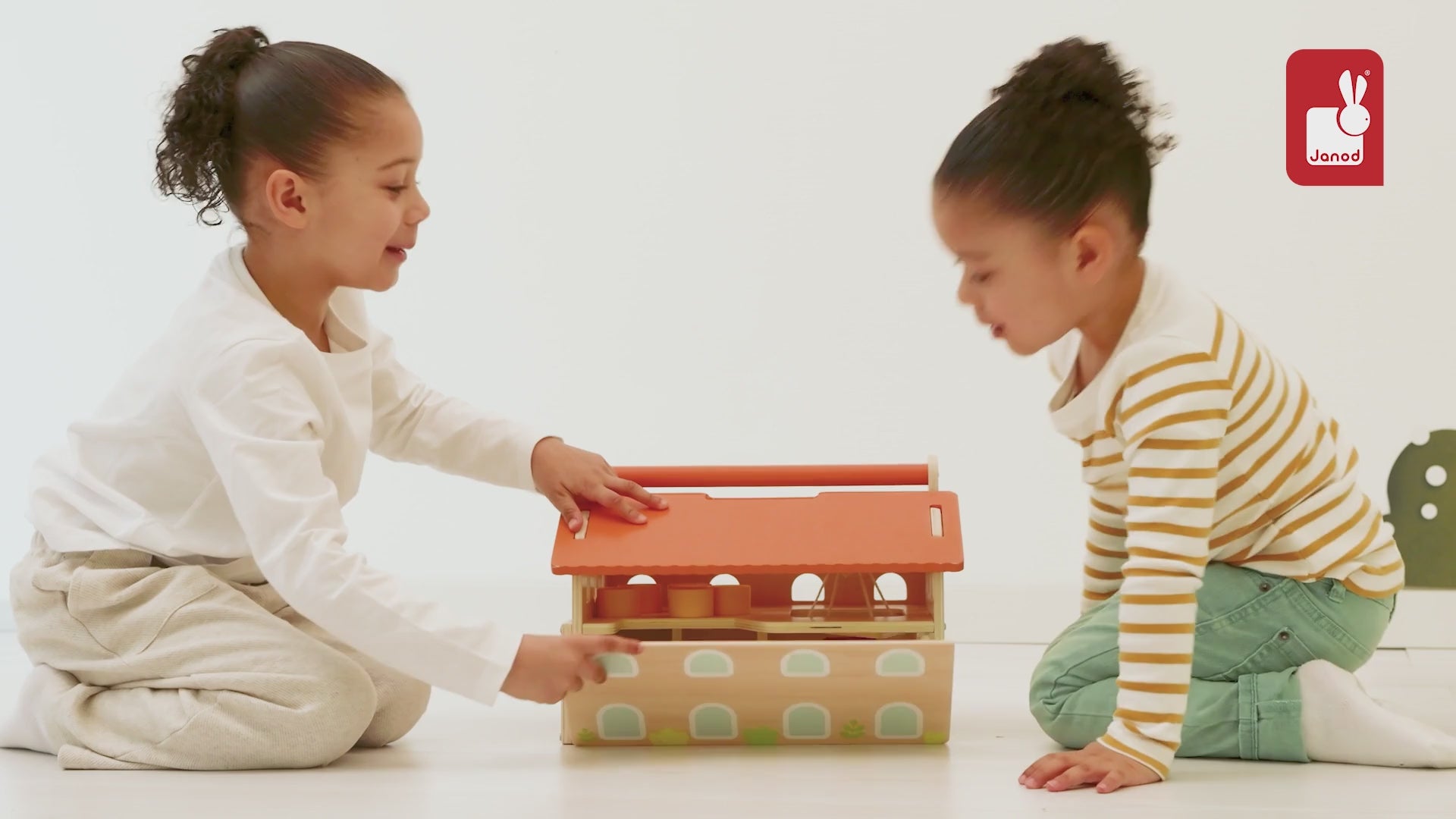 The sliding doors can be opened wide to let all the animals in. This magnificent wooden farmhouse comes with 10 animals, 5 bales of hay and a tractor with a magnetic trailer. Several pieces of equipment are also supplied - a pulley system that goes up and down, sliding doors and an elastic-hinged door. The farmhouse opens in 2 different ways to make playing inside really easy - The 2 roof sections can be removed, and one of the sides of the farmhouse opens and closes by magnetic closure. Ideal for reaching the animal stalls or storing the bales of straw on the upper level.
