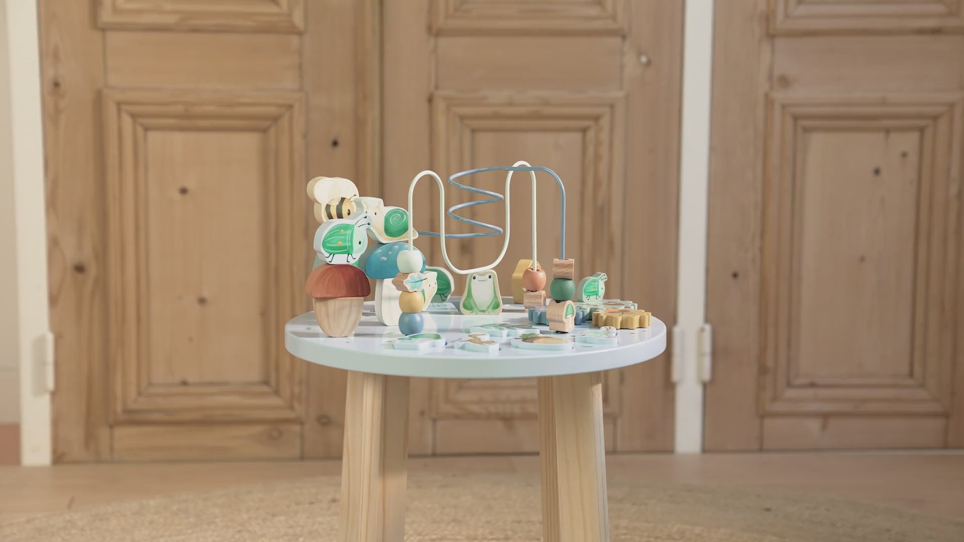 Forest FriendsStand up to play. Discover the many activities this table has to offer. Bring the beads along the spiral from one side of the enchanted forest to the other side. Or build a tower and fill the forest with trees of joy. Complete the puzzle, turn the wheels and help the lovely animals cross the Forest Friends woodlands. This wooden multi-activity table challenges your little one in many ways.
