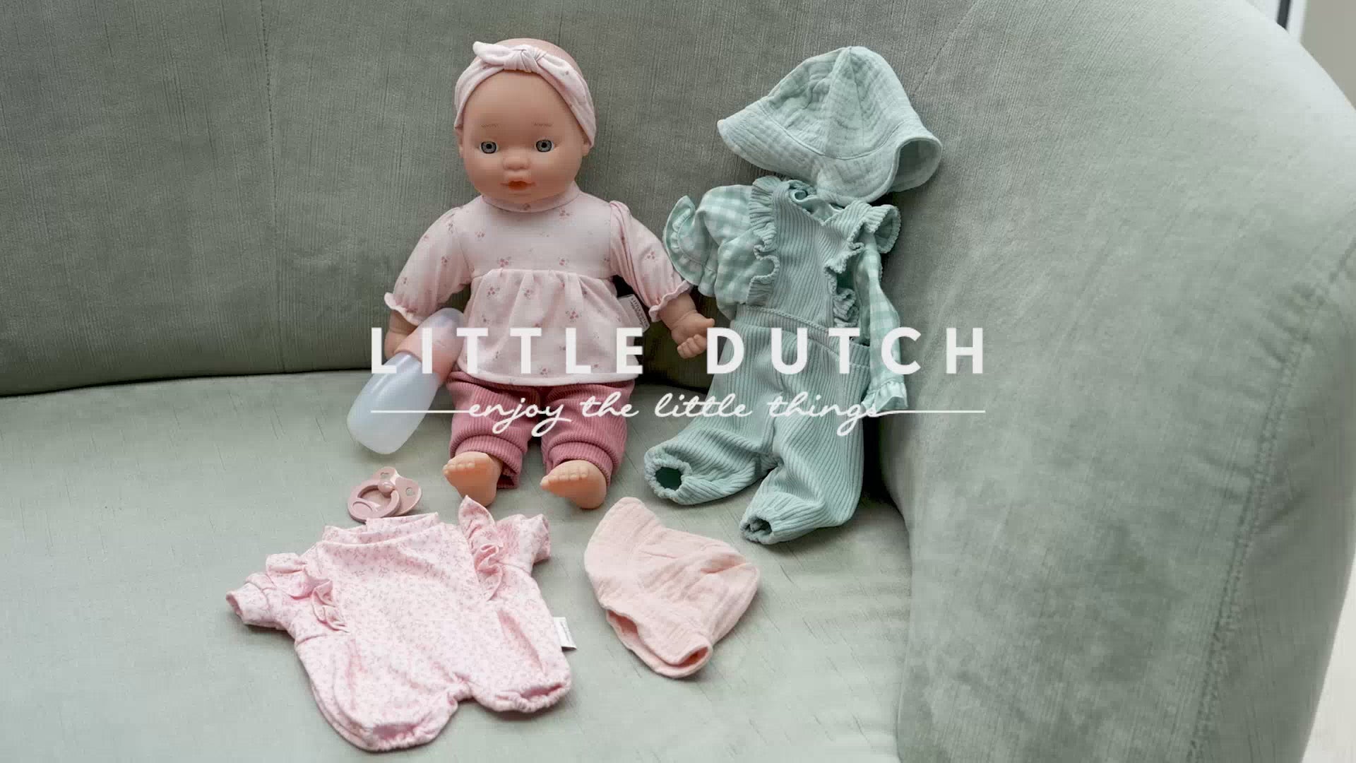 Kate wears a hairband, long-sleeved dress in the Rosy Meadows design, styled with pink ribbed pants. Changing her clothes promotes fine motor skills, and the pacifier and milk bottle add an element of interactive play.