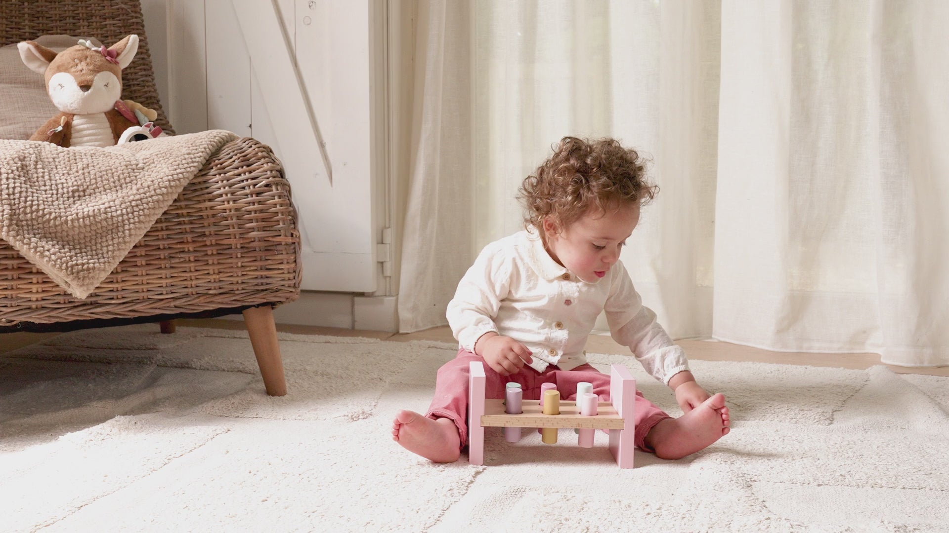 Fairy GardenTap tap tap. Use the mallet to pound the 6 coloured pegs into the wooden pounding bench and explore the magic of Fairy Garden. Finished pounding. Turn the bench around and start again. This is a very good exercise for the development of motor skills that will surely keep your little one entertained for a while.