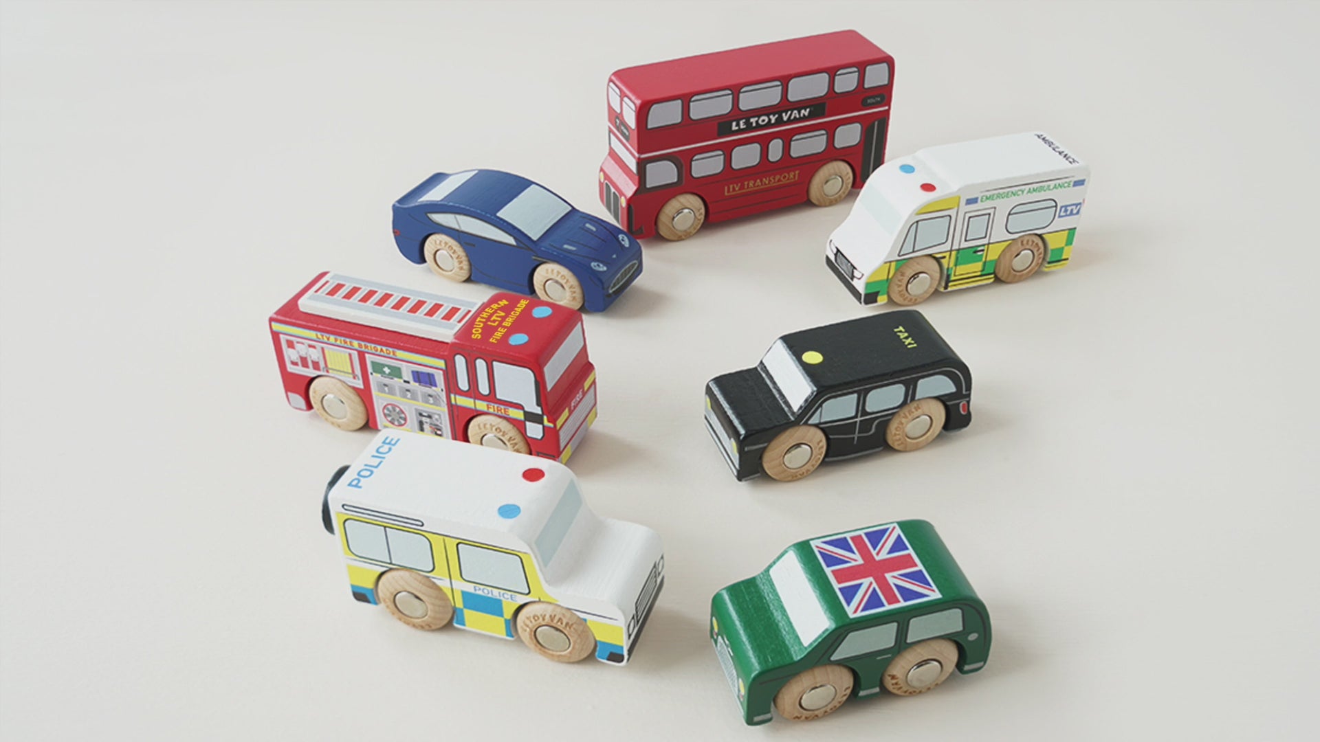Includes 7 iconic London vehicles - a double decker bus, black taxi, fire engine, police van, ambulance and 2 sporty cars.