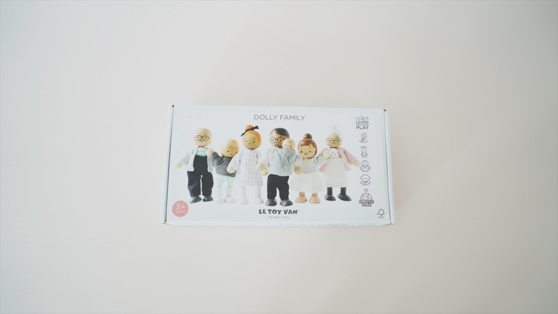 A wooden poseable doll family dressed in hand finished pretty outfits.