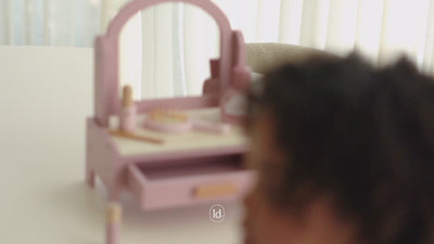 Get your best accessories ready and take a seat in front of the mirror. This gorgeous wooden dressing table features a rotating mirror and comes with six stylish beauty products, such as a hairbrush, lipstick, and perfume. Perfect for little beauty lovers who enjoy dressing up and pampering themselves. Let the imagination flow.
